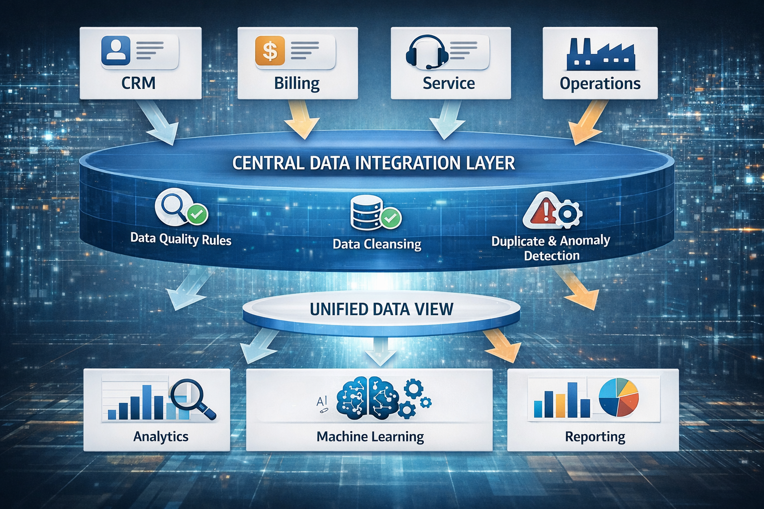 Infoveave’s Unified Data Platform is built specifically for this — connecting your existing CRM, service, billing, and operations data into a single governed customer record, without requiring a platform replacement.